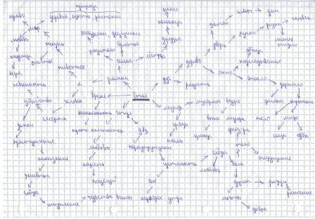 друзьями. ![]() Четвёртая карта Четвёртая карта демонстрирует совершенно иной набор ассоциаций. Видно, что ребёнка совершенно не интересуют предметы окружающего мира сами по себе. Они приобретают для него смысл только в контексте человеческих взаимоотношений. Поэтому в карте практически отсутствуют какие-либо признаки стола как искусственного физического тела, предназначенного для удовлетворения некоторых потребностей. Ассоциативный ряд ребёнка сразу выводит его в мир непростых человеческих отношений и сильных отрицательных эмоций. Ближайшими ассоциациями к слову "человек" оказываются "убийца", "наказание", "слёзы". И всё это приходит на ум ребёнку, когда он слышит простое слово "стол"! Можно предположить, что жизнь ребёнка каким-то образом связана с вмешательством правосудия, так как слово "право" сопровождается тремя восклицательными знаками, а слово "убийца" ассоциируется со словами "закон" и "наказание". Весьма показательно, что в карте вообще отсутствует название левой ветви. Ребёнок осознаёт, что она слабо связана со столом, но не может удержаться от изображения волнующих его ассоциаций. Эти особенности восприятия информации необходимо учитывать в учебном процессе, так как ассоциации определяют контекст, придающий словам определённые значения, что оказывает существенное влияние на возможность адекватного понимания текста. ![]() Пятая карта Пятая карта