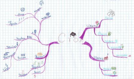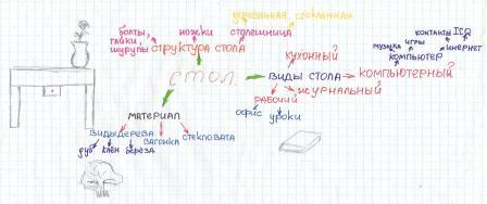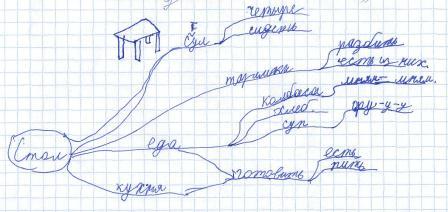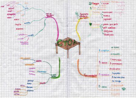 С подробным изложением всех вопросов, связанных с технологией применения интеллект-карт в учебном процессе, можно познакомиться на курсах повышения квалификации для работников образования, проводимых Е.А. Бершадской. На этой странице сайта приведены несколько примеров ученических карт, которые показывают возможности данного метода для получении информации об особенностях когнитивного развития учащихся. Как мыслят школьники? Интеллект-карты являются очень мощным средством изучения особенностей личностного развития, мировосприятия и мышления учащихся. Они проявляются при рисовании любых интеллект-карт, темы которых могут быть посвящены простейшим бытовым понятиям. В качестве примера приведём примеры пяти интеллект-карт, на которых учащиеся изображали ассоциативную сеть, связанную с понятием "стол". ![]() Первая карта На первой карте (по ссылке откроется для просмотра), рисунок которой приведён выше, хорошо просматривается классификация ассоциаций, связанных с понятием "стол", по тем признакам, которые ученик считает существенными. Выделены четыре основные ассоциативные ветви, имеющие разветвлённые цепи вторичных ассоциаций. Хорошо видны ошибки детского мышления. Вместо типологии столов в зависимости от их функционального назначения ребёнок вводит ветвь с названием "где находится" стол. В результате столы с одинаковыми функциями попадают в разные вторичные ветви. Для обозначения функций стола вводятся две очень похожие главные ветви "предметы, стоящие на нём" и "что на нём можно делать", которые на самом деле связаны причинно-следственными зависимостями. Это приводит к повторению вторичных ассоциаций, однако связи между ними на карте не показаны. В ветвь "из чего сделан" попадают столешница, ящики и ножки, которые являются составными частями стола, а не тем, из чего он сделан. Тетради, книжки и дневник также оказываются составными частями стола. Отсутствует ассоциация с родовым понятием мебели (интересно, но этот эффект наблюдается во всех детских работах). Даже эти поверхностные наблюдения позволяют сделать вывод, что семантические сети ребёнка частично строятся по случайным признакам, плохо структурированы и дифференцированы и существенно не полны. ![]() Вторая карта Вторая